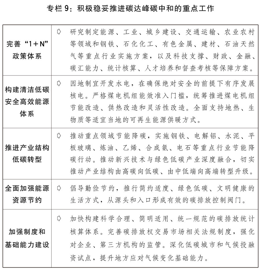 二是積極穩妥推進碳達峰碳中和。完善碳達峰碳中和“1+N”政策體系,實施“碳達峰十大行動”,堅持“全國一盤棋”。大力發展非化石能源,建設大型風電、光伏基地項目,積極發展分布式新能源,積極推動海上風電集群化開發,穩妥推進西南等地大型水電基地建設,大力發展抽水蓄能,在確保絕對安全的前提下積極有序發展核電,推進煤炭清潔高效利用。提升電網對可再生能源發電的消納能力。做好全國碳排放權交易市場第二個履約周期管理。實施節能降碳改造升級。積極研究開發碳捕捉利用與封存技術。優化完善能耗雙控政策,合理增加能耗總量彈性,新增可再生能源和原料用能不納入能源消費總量控制,推動能耗“雙控”向碳排放總量和強度“雙控”轉變。全面加強能源資源節約,強化工業、交通和建筑節能,不斷降低單位產出能耗物耗和碳排放。對標能效標桿水平,推動能效低于基準水平的重點行業企業,有序實施改造升級,促進高耗能行業高質量發展。繼續做好碳達峰碳中和及應對氣候變化國際談判與合作,主動參與全球綠色治理體系建設,加強綠色經貿、技術與金融合作。
