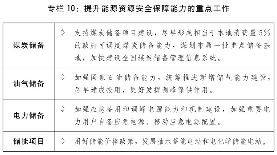 能源方面的主要任務為:提升能源資源安全保障能力。深入推進煤電油氣產供儲銷體系建設。推進石油儲備重大工程建設,加快華北、西北等地下儲氣庫新建和擴容達容建設。有序核增一批煤炭先進產能,加快提升煤炭儲備能力。加強抽水蓄能等調峰電源建設,繼續發揮傳統能源特別是煤炭、煤電的兜底保供和調峰作用,積極推進現有煤電項目改造升級。推進白鶴灘、羊曲等重大水電工程建設。加大力度規劃建設以大型風光電基地為基礎、以其周邊清潔高效先進節能的煤電為支撐、以穩定安全可靠的特高壓輸變電線路為載體的新能源供給消納體系。加快推進國家儲備建設,健全統一的戰略和應急物資儲備體系。