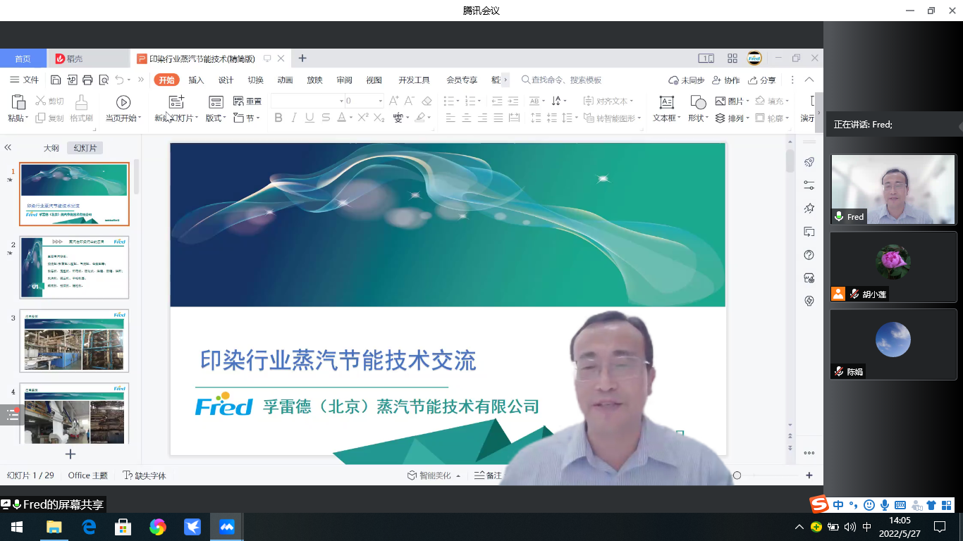 2022年5月27日孚雷德(北京)蒸汽節能技術有限公司在Clean by Design(CbD)國際綠色供應鏈創新項目組織的紡織行業應對氣候變化專才系列技術培訓課程中為幾十家印染企業提供了主題為“印染行業蒸汽系統節能減排”的線上技術培訓。